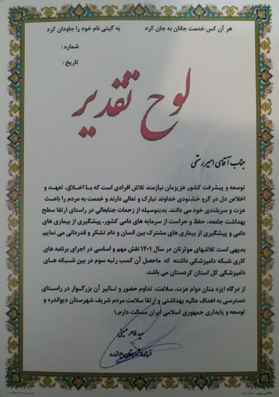 اهداء لوح تقدیر فرماندار دیواندره به کلیه کارکنان شبکه دامپزشکی دیواندره