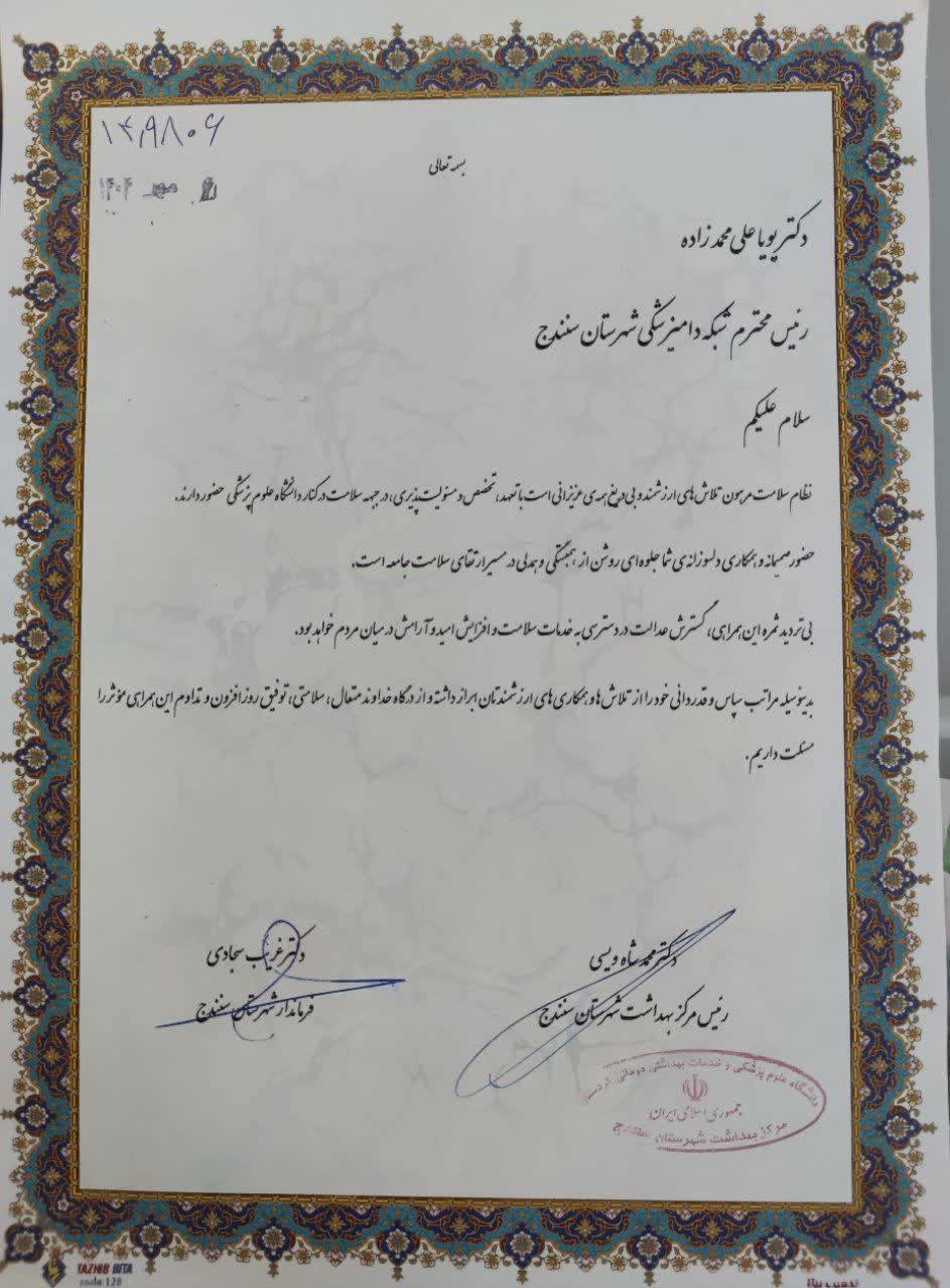 در این مراسم، فرماندار سنندج و رئیس مرکز بهداشت شهرستان با اهدای لوح سپاس، از تعاملات انجام شده با مرکز بهداشت و زحمات دکتر علیمحمدزاده در راستای ارتقای سلامت عمومی، بهبود امنیت غذایی و پیشگیری از بیماریهای مشترک بین انسان و دام قدردانی کردند.