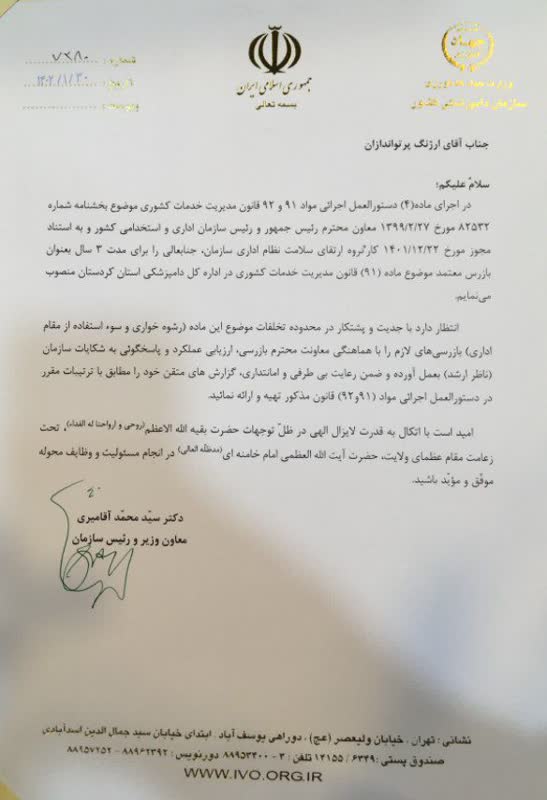 آقای ارژنگ پرتواندازان پور به عنوان بازرس معتمد اداره کل دامپزشکی کردستان به مدت ۳ سال منصوب گردید
