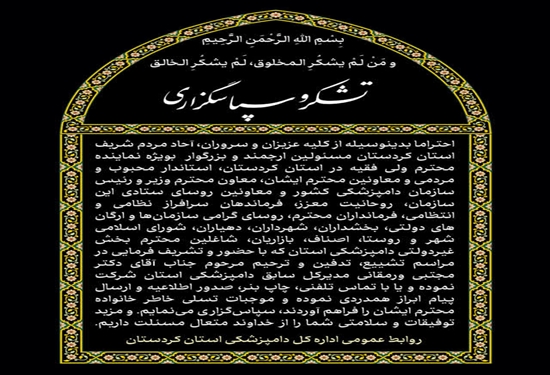 احتراما بدینوسیله از کلیه عزیزان و سروران، آحاد مردم شریف استان کردستان مسئولین ارجمند و بزرگوار بویژه نماینده محترم ولی فقیه در استان کردستان، استاندار محبوب و مردمی و معاونین محترم ایشان، معاون محترم وزیر و رئیس سازمان دامپزشکی کشور و معاونین، روسای ستادی این سازمان، روحانیت معزز، فرماندهان سرافراز نظامی و انتظامی، فرمانداران محترم، روسای گرامی سازمانها و ارگانهای دولتی، بخشداران، شهرداران، دهیاران، شورای اسلامی شهر و روستا، اصناف، بازاریان، شاغلین محترم بخش غیردولتی دامپزشکی استان که با حضور و تشریف فرمایی در مراسم تشییع، تدفین و ترحیم مرحوم جناب آقای دکتر مجتبی ورمقانی مدیرکل سابق دامپزشکی استان شرکت نموده و یا با تماس تلفنی، چاپ بنر، صدور اطلاعیه و ارسال پیام ابراز همدردی نموده و موجبات تسلی خاطر خانوده محترم ایشان را فراهم آوردند، سپاسگزاری مینمایم. و مزید توفیقات و سلامتی شما را از خداوند متعال مسئلت داریم.