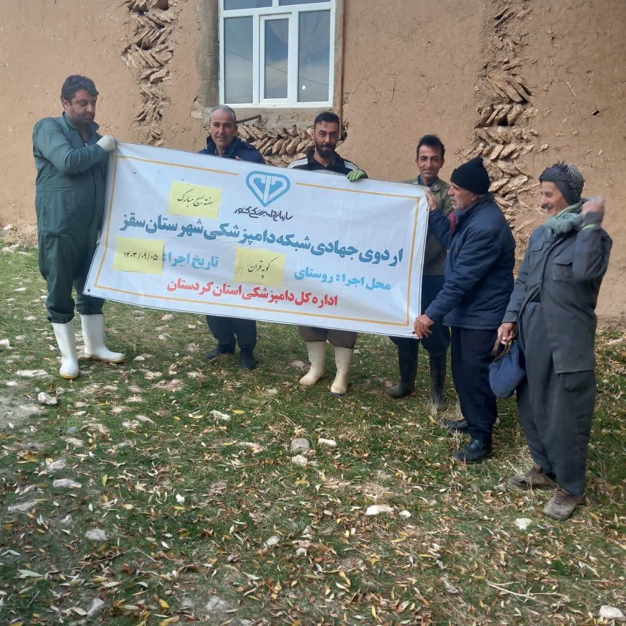 به گزارش روابط عمومی اداره کل دامپزشکی استان کردستان، رئیس شبکه دامپزشکی سقز در گفتگویی اظهار داشت: در راستای حمایت از تولیدات دامی و کمک به معیشت روستاییان و دامداران، کارشناسان شبکه دامپزشکی سقز در چهارم و پنجم آذرماه سال‌جاری همزمان با هفته بسیج در روستاهای "قاقل آباد" و "کوپه قران" اقدام به برگزاری اردوی جهادی نمودند.