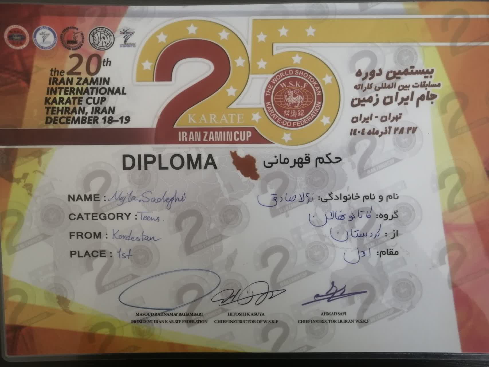 به گزارش روابط عمومی ادارهکل دامپزشکی استان کردستان، نژلا صادقی در بیستمین دوره مسابقات بینالمللی کاراته جام ایرانزمین که به میزبانی تهران برگزار شد، موفق شد در گروه نونهالان B و در بخش کاتای انفرادی با عملکردی شایسته، مقام اول این رقابتها را از آنِ خود کند.
