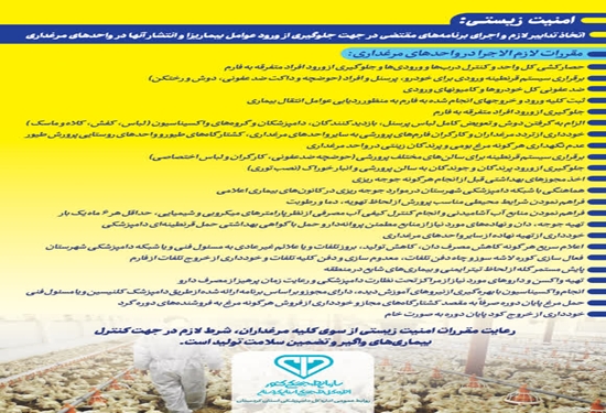 رعایت مقررات امنیت زیستی از سوی کلیه مرغداران، شرط لازم در جهت کنترل بیماریهای واگیر و تضمین سلامت تولید است.