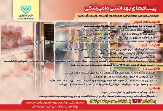* هنگام خرید گوشتهای تازه و منجمد بسته بندی شده به سالم بودن بسته بندی و دارا بودن مشخصات کامل از جمله پروانه سازمان دامپزشکی دقت فرمائید