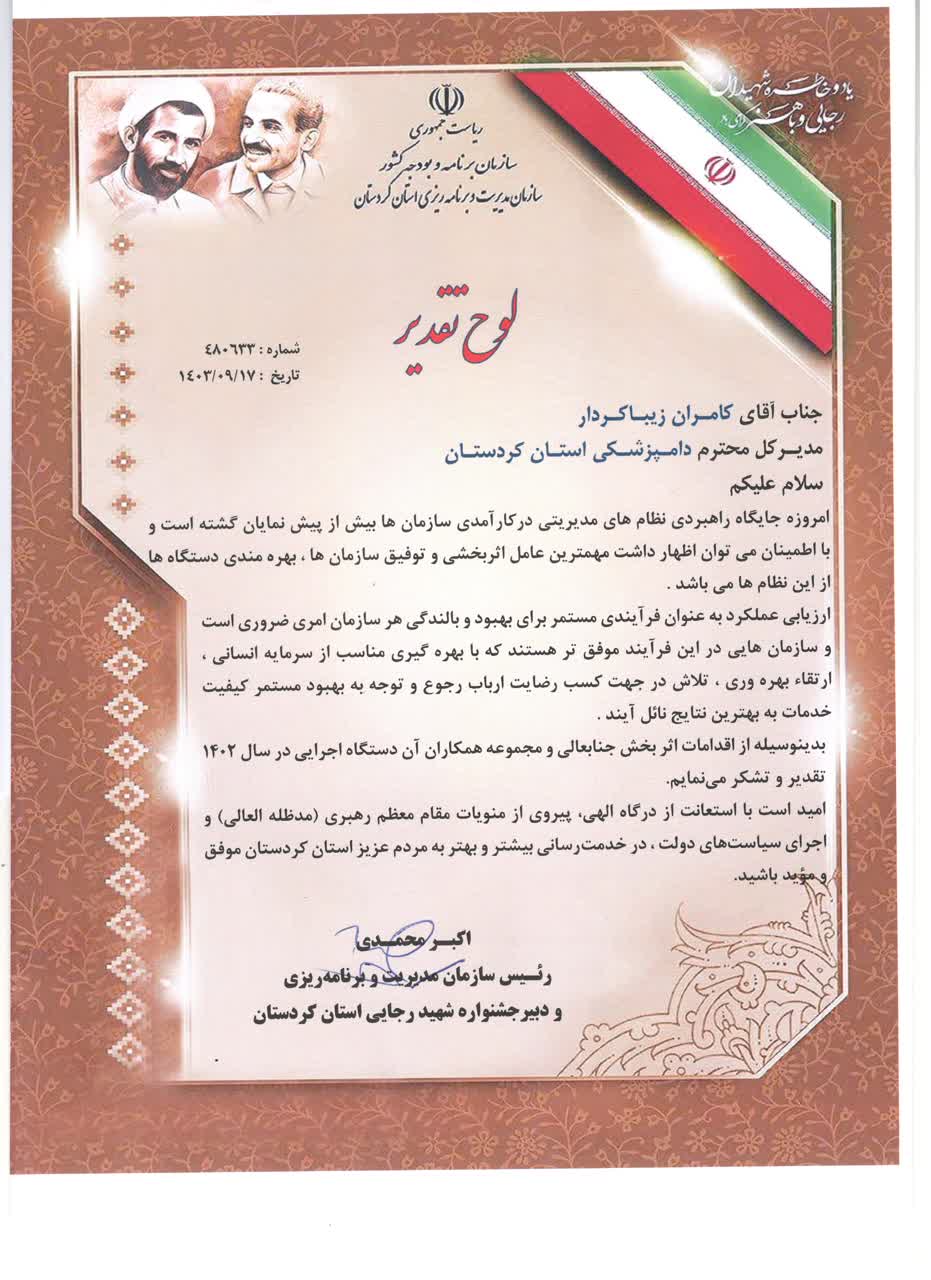 تقدیر از اقدامات اثربخش اداره کل دامپزشکی استان کردستان در جشنواره شهید رجایی